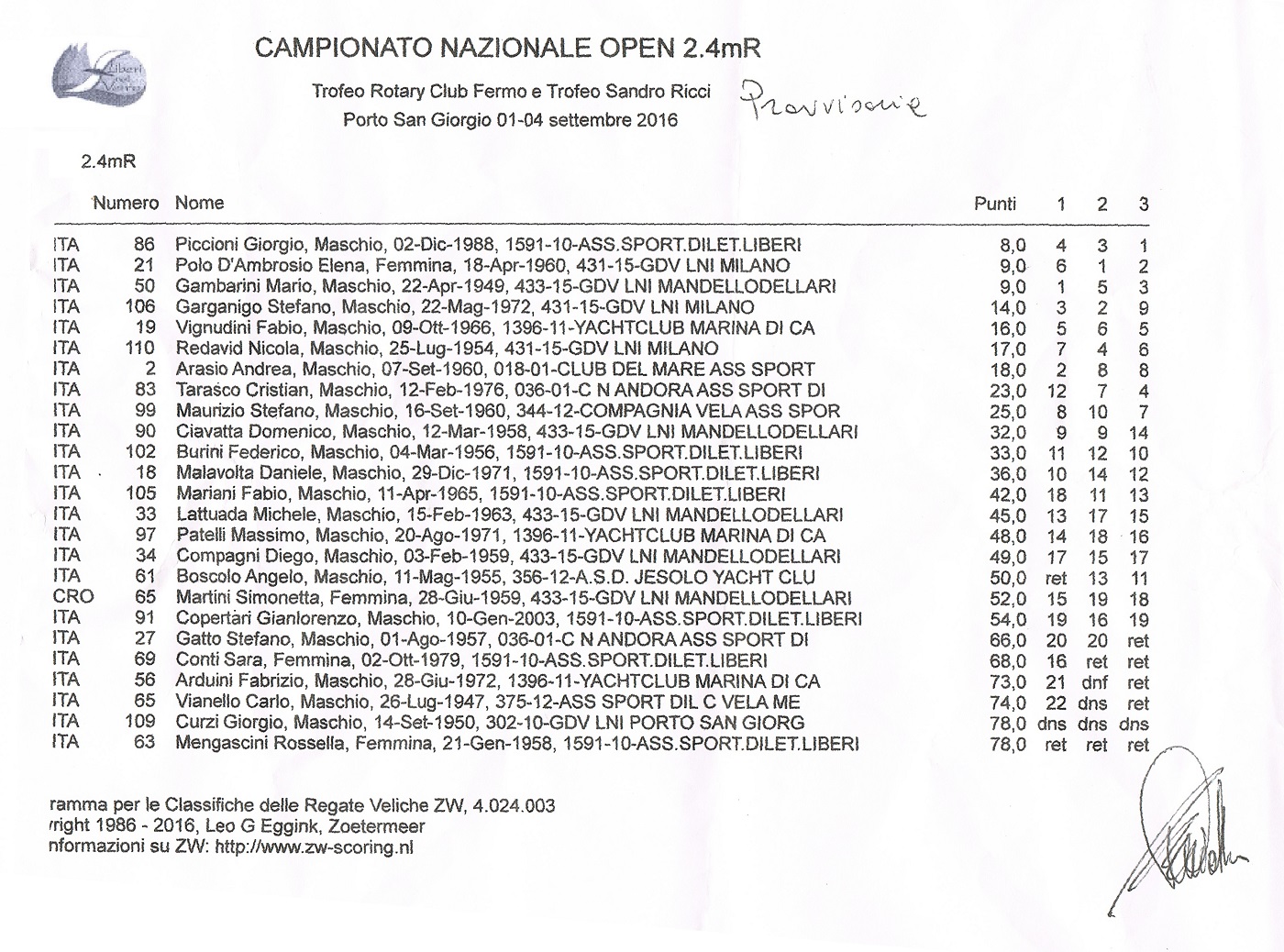 Grande vela nelle acque antistanti il litorale fermano-sangiorgese in occasione dell’edizione 2016 del Campionato Nazionale della Classe Italiana 2.4mr, valida anche come Decima edizione del Trofeo Sandro Ricci – Trofeo Rotary Fermo, organizzato dal circolo velico A.s.d. Liberi nel Vento in collaborazione con la Lega Navale di Porto San Giorgio.