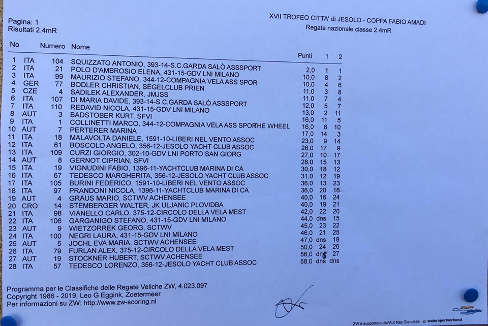 Nella II prova del Campionato Zonale classe 2.4mR, disputata contestualmente al Trofeo Città di Jesolo, ha primeggiato Stefano Maurizio, seguito da Marco Collinetti (Compagnia della Vela) e da Angelo Boscolo (Jesolo_Yacht_Club).
