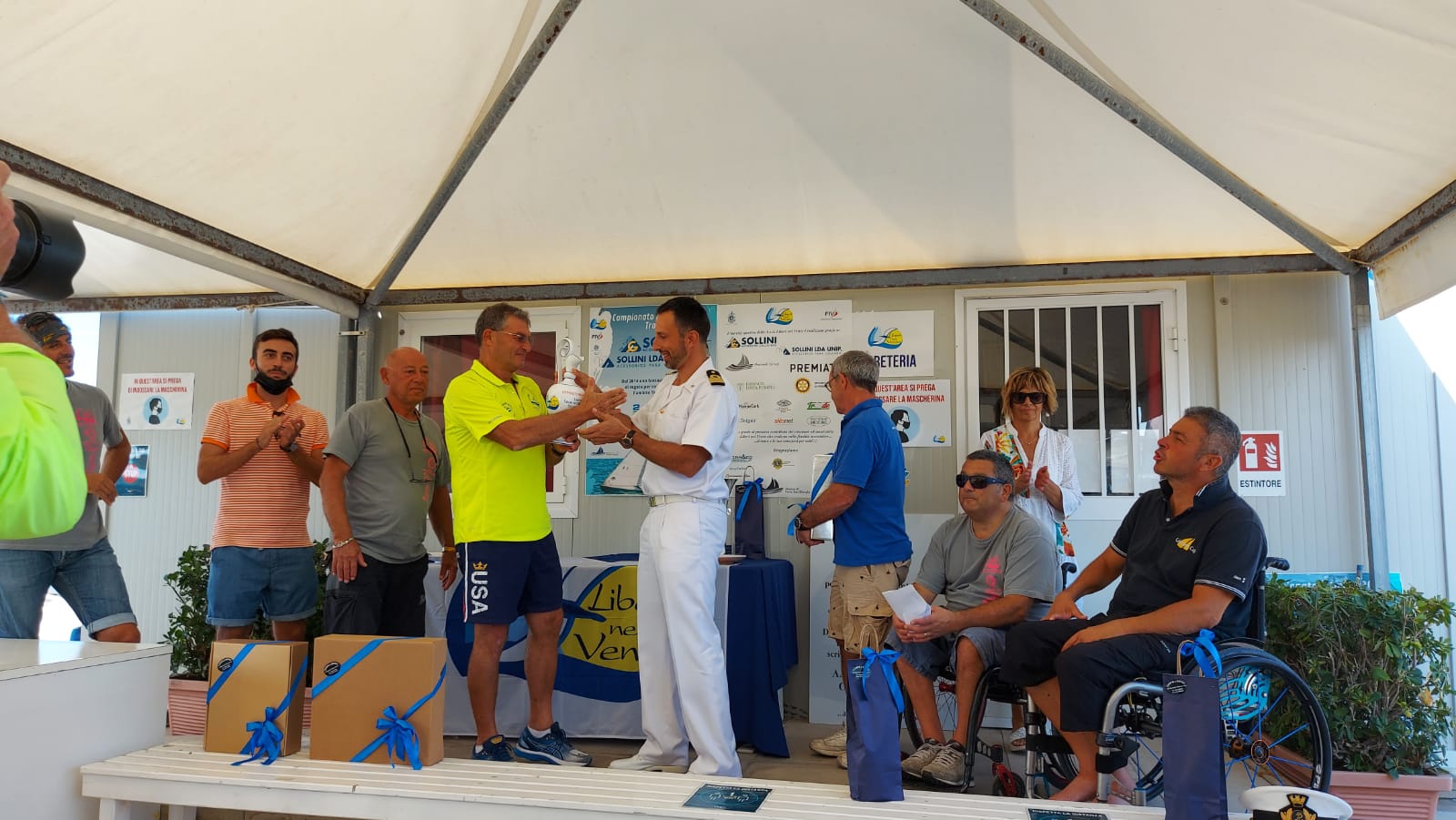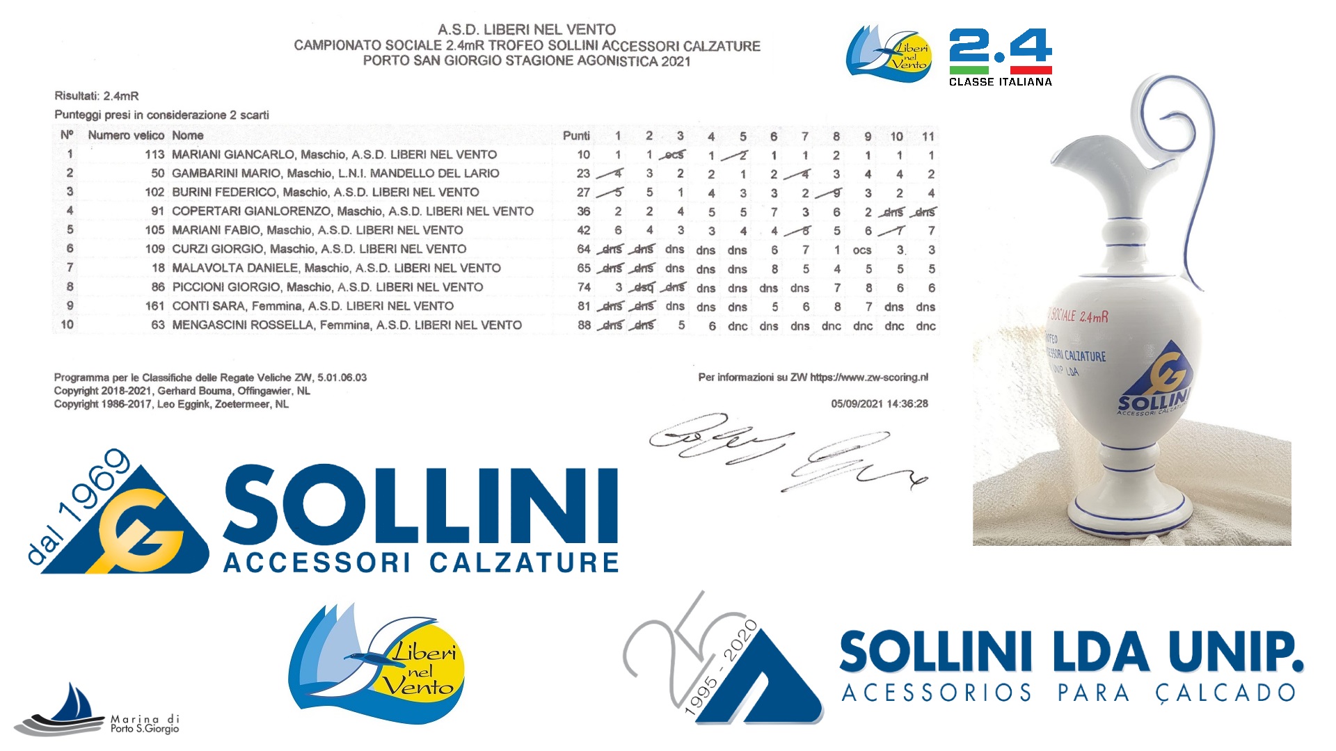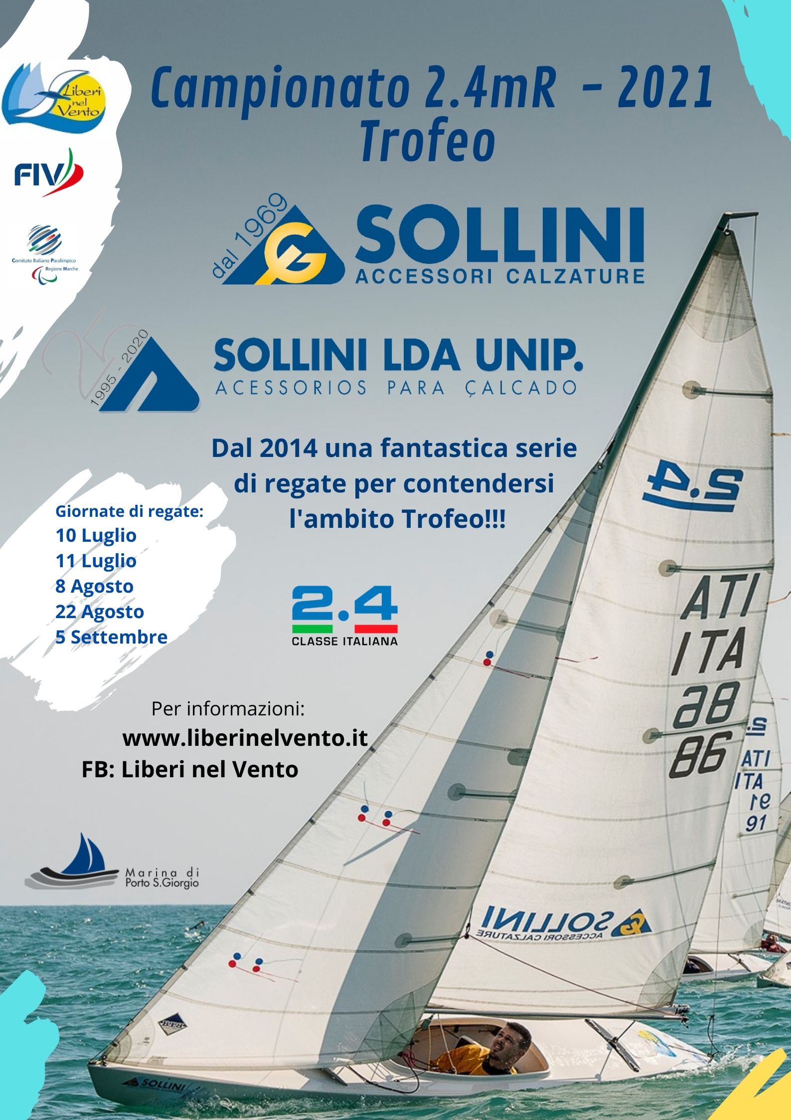 Grande vela nelle acque antistanti il litorale di Porto San Giorgio per l'ultima giornata di regate del Campionato Sociale 2.4mR - 2021 - Trofeo Sollini Accessori Calzature - Sollii Unip Lda. Evento sportivo che viene organizzato dal 2014 grazie alla gentilissima collaborazione della proprietà delle aziende Sollini Accessori Calzature - Sollini Unip Lda. Graditissima sorpresa alla base nautica Liberi nel Vento la presenza del nuovo Comandante della Capitaneria di Porto San Giorgio T.V.(C.P.) Cristiano Caluisi e Signora. Al Comandante lo staff della Liberi nel Vento ha illustrato la base nautica, le finalità associative e presentato il team della Liberi Nel Vento. Comandante Caluisi che insieme all'Assessore allo Sport Cristian De Luna ha presenziato alla cerimonia delle premiazioni. Tornando all'evento sportivo giornata soleggiata con un bel vento teso da nord, 15-20 nodi, dove Giancarlo Mariani ha primeggiato in tutte e due le prove consolidando la vittoria del Campionato 2.4mR 2021 davanti a Mario Gambarini e Federico Burini. Un ringraziamento va all'Ufficiale di Regata Giampaolo Cognigni e alla Decima Zona Fiv per la gentile collaborazione. Iniziative sportive realizzate in collaborazione con il Marina di Porto San Giorgio - Marinedì, Lega Navale di Porto San Giorgio, Croce Azzurra di Porto San Giorgio, Protezione Civile di Porto San Giorgio e Foto Cine Club Fermo. A seguire comunicato stampa.