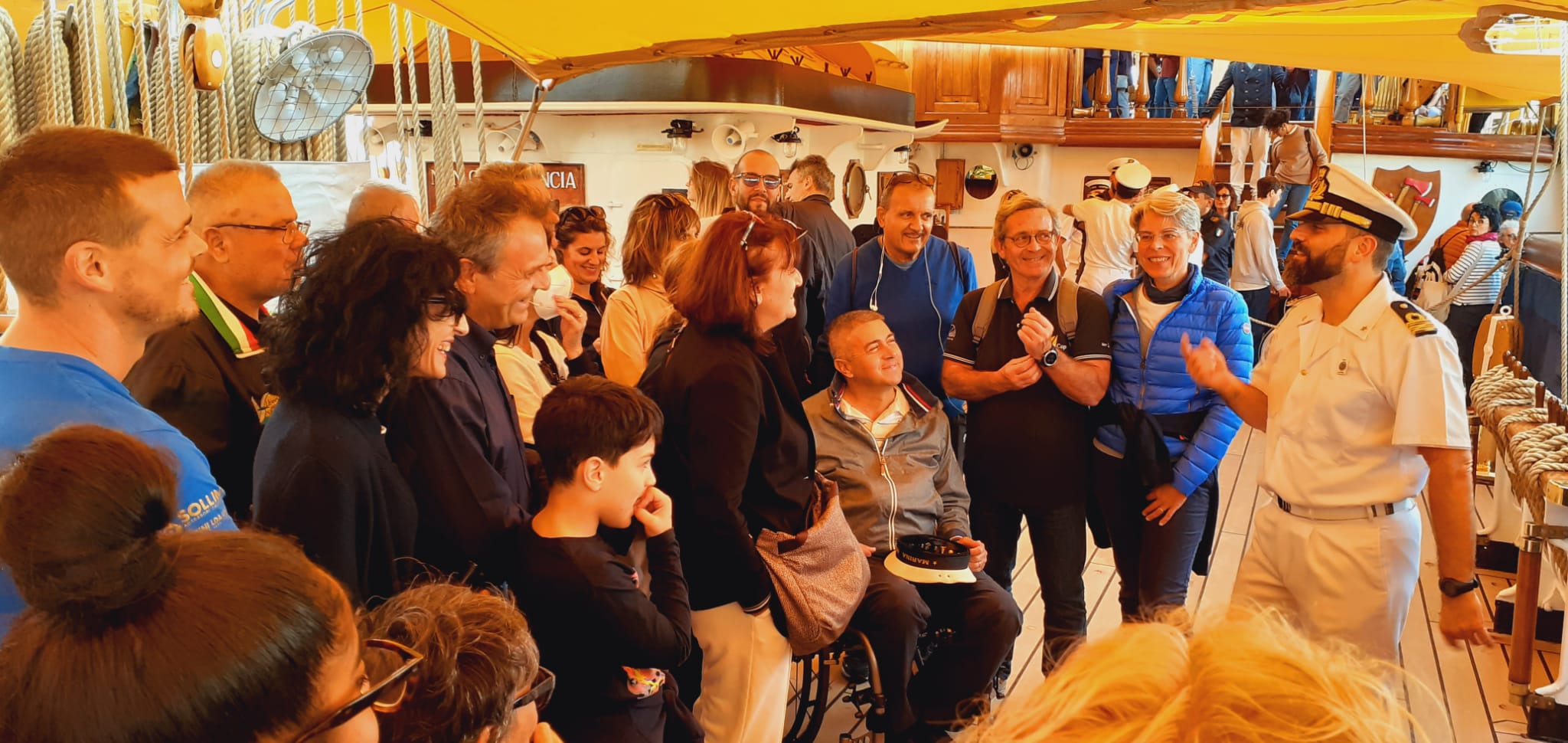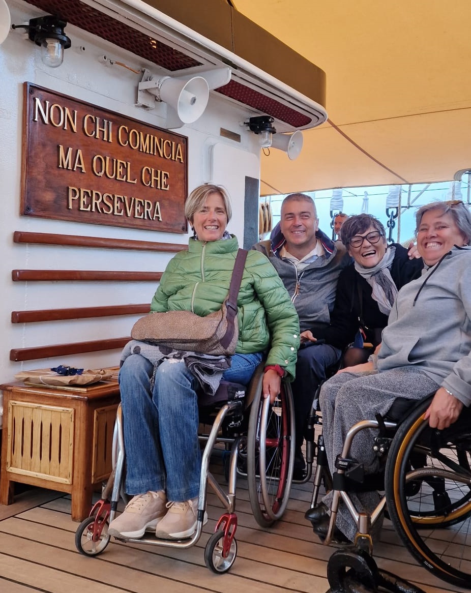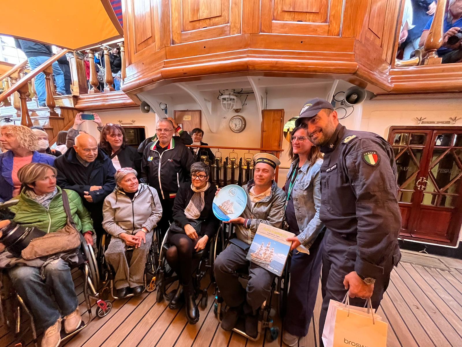 “Da velisti siamo stati ospiti della barca a vela per eccellenza. La più bella ed affascinante di tutte, quella che abbiamo incontrato tante volte ma che non avevamo mai avuto la fortuna di visitare. Bella, bellissima, con una storia affascinante ed un equipaggio gentilissimo che hanno fatto salire anche noi in carrozzina passando, non con poca fatica, sul barcarizzo fin sulla coperta. – dice il Presidente Daniele Malavolta – Molto intenso il momento in cui ci siamo trovati davanti alla targa dove è scritto il motto di Nave Amerigo Vespucci: Non chi comincia ma quel che persevera. Devo, dobbiamo con piacere ringraziare la Marina Militare, l’Ammiraglio di Divisione Carmelo Bonfiglio che hanno permesso di farci vivere questi momenti emozionati, il Comandante, il Tenente Pesce e l’equipaggio per la gentile ospitalità. Un grazie anche all’imprenditore Francesco Reali che ha messo a disposizione della Liberi nel Vento, gratuitamente, un pullman per la trasferta in occasione della visita a Nave Amerigo Vespucci”.