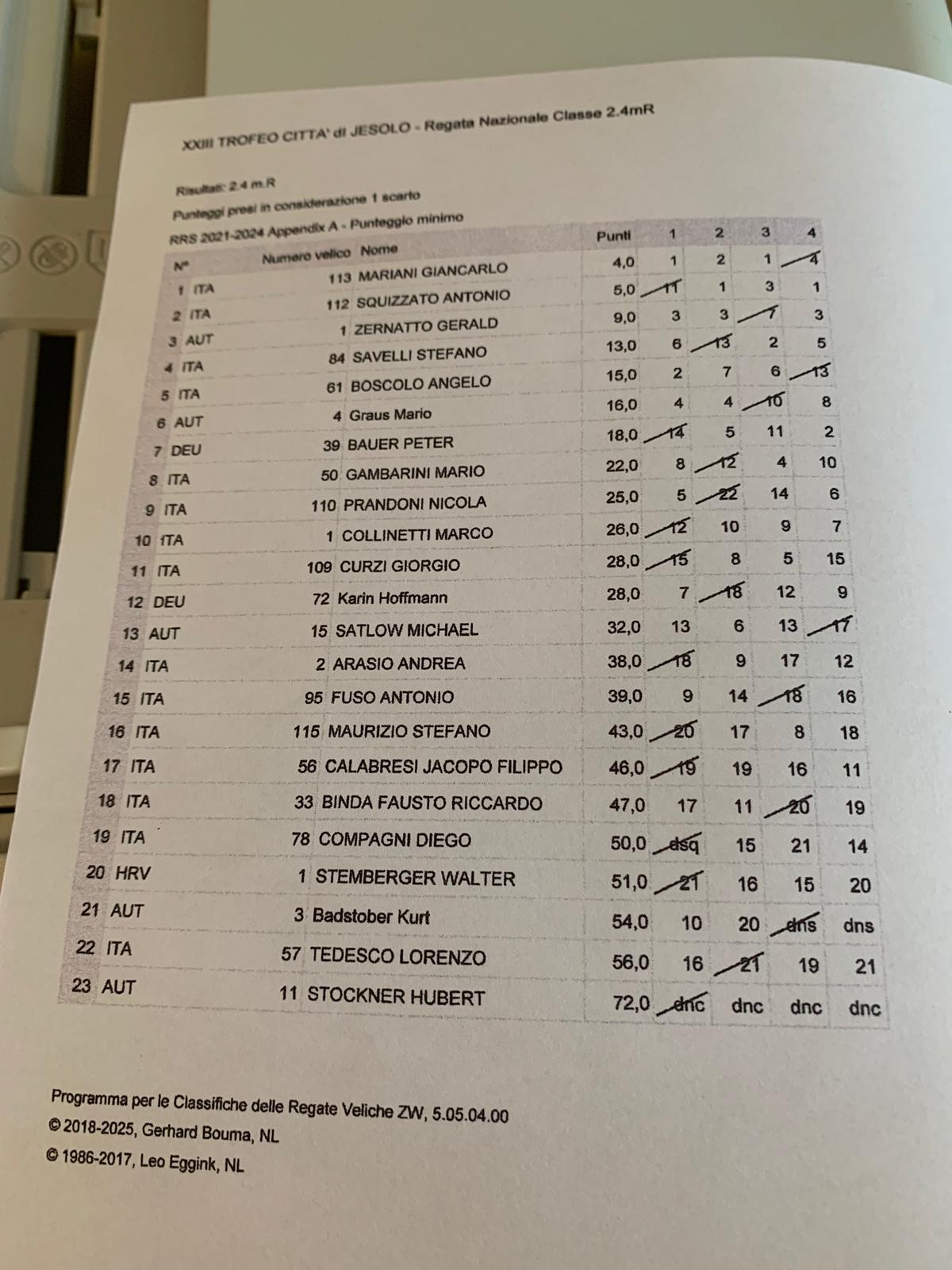 Con una condotta impeccabile (1,2,1,4) Giancarlo Mariani, dopo la vittoria del 2022, torna sul gradino più alto a Jesolo. Secondo classificato Antonio Squizzato, Campione Italiano ed argento parasailing al Mondiale 2024, della Società Canottieri Garda Salò, terzo classificato il concorrente austriaco Gerald Zernatto.